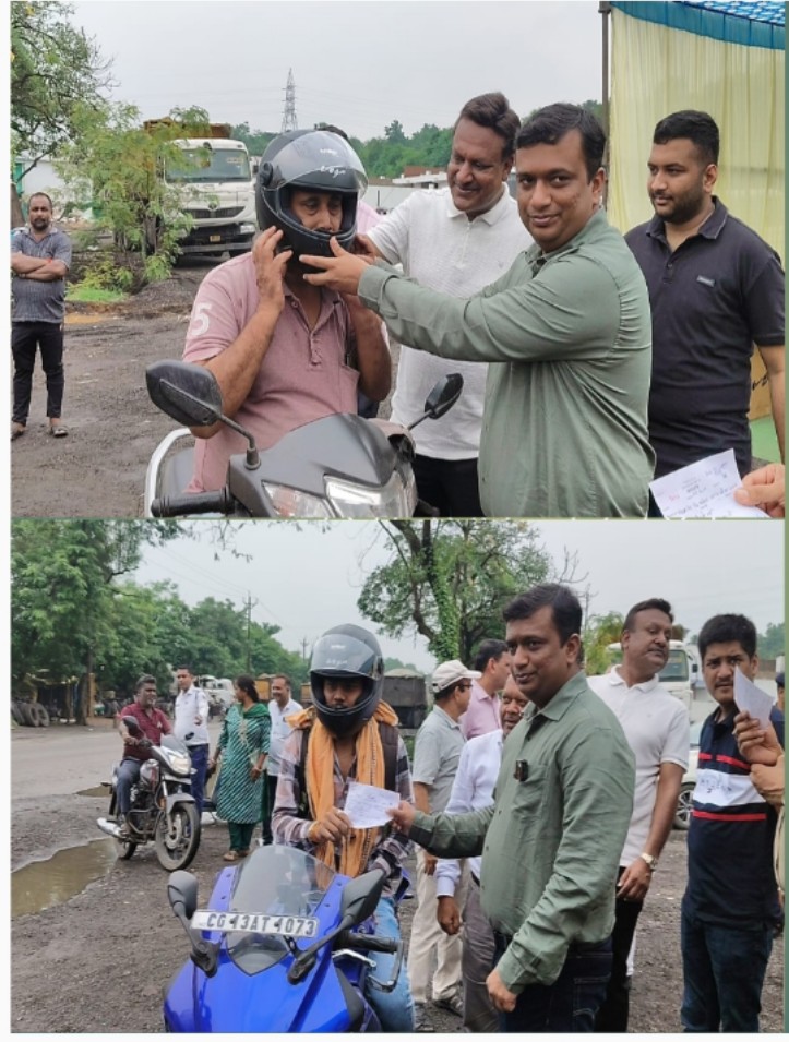 आज, रायगढ़-पूंजीपथरा मार्ग के उर्दना पुलिस लाइन के समीप, एसपी श्री दिव्यांग पटेल ने यातायात पुलिस और समाजसेवियों के साथ मिलकर नियम तोड़ने वाले वाहन चालकों को निशुल्क हेलमेट का वितरण किया। एसपी पटेल ने इस अवसर पर नागरिकों से अपील की कि वे स्वयं की सुरक्षा और परिवार की जिम्मेदारी को ध्यान में रखते हुए वाहन चलाते समय हमेशा हेलमेट पहनें।