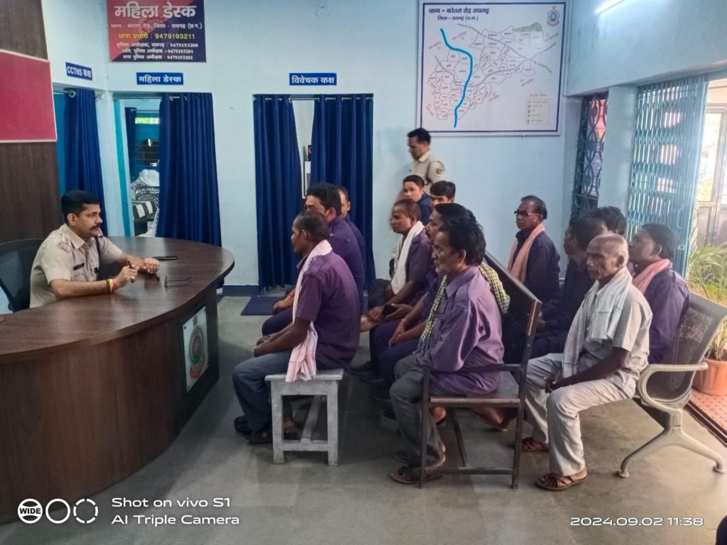 02 सितंबर, रायगढ़* । पुलिस अधीक्षक श्री दिव्यांग कुमार पटेल के मार्गदर्शन में आज दिनांक 02 सितंबर 2024 को थाना खरसिया, कोतरारोड़ और जूटमिल में ग्राम कोटवारों की एक बैठक आयोजित की गई। बैठक में ग्रामीण क्षेत्रों की सुरक्षा और सतर्कता बढ़ाने और अपराधों की रोकथाम के संबंध में थाना प्रभारियों ने ग्राम कोटवारों से महत्वपूर्ण बिंदुओं पर चर्चा कर आवश्यक निर्देश दिए गए: