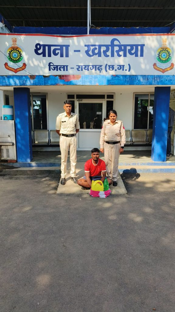 02 सितंबर, रायगढ़* । पुलिस अधीक्षक श्री दिव्यांग कुमार पटेल द्वारा अवैध शराब पर अंकुश लगाने के दिए गये निर्देशों पर थाना प्रभारी खरसिया निरीक्षक कुमार गौरव साहू के नेतृत्व में अवैध शराब पर लगातार कार्रवाई जारी है । इसी क्रम में आज खरसिया थाने की महिला प्रधान आरक्षक सरोजनी राठौर एवं हमराह स्टाफ द्वारा अपराध और शिकायतों की जांच के लिए ग्राम भ्रमण पर थे, छोटे मुडपार में पहुंचने पर एक महत्वपूर्ण सूचना प्राप्त हुई। मुखबिर ने जानकारी दी कि ग्राम छोटे मुडपार का निवासी परदेशी पटैल, सोनबरसा की ओर से महुआ शराब थैले में लेकर छोटे मुडपार की ओर अवैध बिक्री के लिए आ रहा है। इस सूचना पर तत्काल कार्रवाई करते हुए, पुलिस ने गवाहों के साथ भैनापारा रोड पर घेराबंदी की और आरोपी परदेशी पटैल (उम्र 29 वर्ष) को पकड़ा। उसके पास से एक प्लास्टिक की जरीकन और एक प्लास्टिक की बोतल में लगभग 7 लीटर महुआ शराब, जिसकी कीमत ₹700/- आंकी गई है, जप्त की गई। आरोपी परदेशी पटैल के खिलाफ थाना खरसिया में धारा 34(2), 59(क) आबकारी एक्ट के तहत मामला दर्ज कर कार्रवाई की गई है। शराब रेड कार्रवाई में महिला प्रधान आरक्षक सरोजनी राठौर, आरक्षक अशोक कंवर, रमेश कुमार बरेठ और योगेश साहू शामिल थे ।