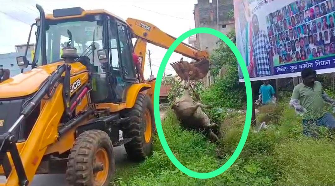 लैलूँगा पशु चिकित्सालय के पास नाली में मृत अवस्था में पड़ी बैल अधिकारियों द्वारा 2 दिन बाद उठवाया गया