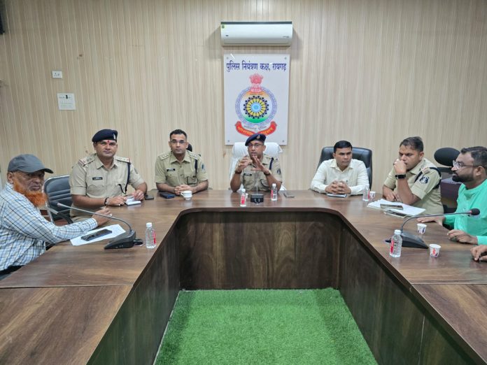 अतिरिक्त पुलिस अधीक्षक आकाश मरकाम ने ध्वनियंत्रों के नियंत्रित उपयोग और यातायात प्रबंधन पर जोर दिया और सांप्रदायिक एकता का परिचय देते हुए शांति और सामुदायिक सौहार्द से मनाए जाने की अपील की । अतिरिक्त पुलिस अधीक्षक ने कहा कि जुलुस व विसर्जन के दौरान सड़क में जाम ना लगे, इसका ध्यान रखें । गणेश विसर्जन के दौरान सुरक्षा का विशेष ध्यान रखें । सुरक्षा व शांति व्यवस्था को लेकर पुलिस की व्यापक व्यवस्था रहेगी । इस बैठक की अध्यक्षता अतिरिक्त पुलिस अधीक्षक आकाश मरकाम ने की, बैठक में नगर पुलिस अधीक्षक आकाश शुक्ला, तहसीलदार रायगढ़ शिव कुमार डनसेना, नगर निरीक्षक प्रशांत राव आहेर, मोहन भारद्वाज, उप निरीक्षक ऐनु देवांगन, डीपी साहू (जिविशा), गणेश समिति व मुस्लमि समुदाय से शेख कलीमुल्लाह, अनमोल अग्र राहुल, संतोषकुमार सिंह अमित सिंह,तरणजीत भाटिया, विपुल सिंह, अमित सिंह, मो0 आवेश, वसीम खान, दिग्विजय सिंह, हिमांशु सिंह, असगर खान(गुलाब), राज यादव व अन्य गणमान्य नागरिक उपस्थित रहे ।