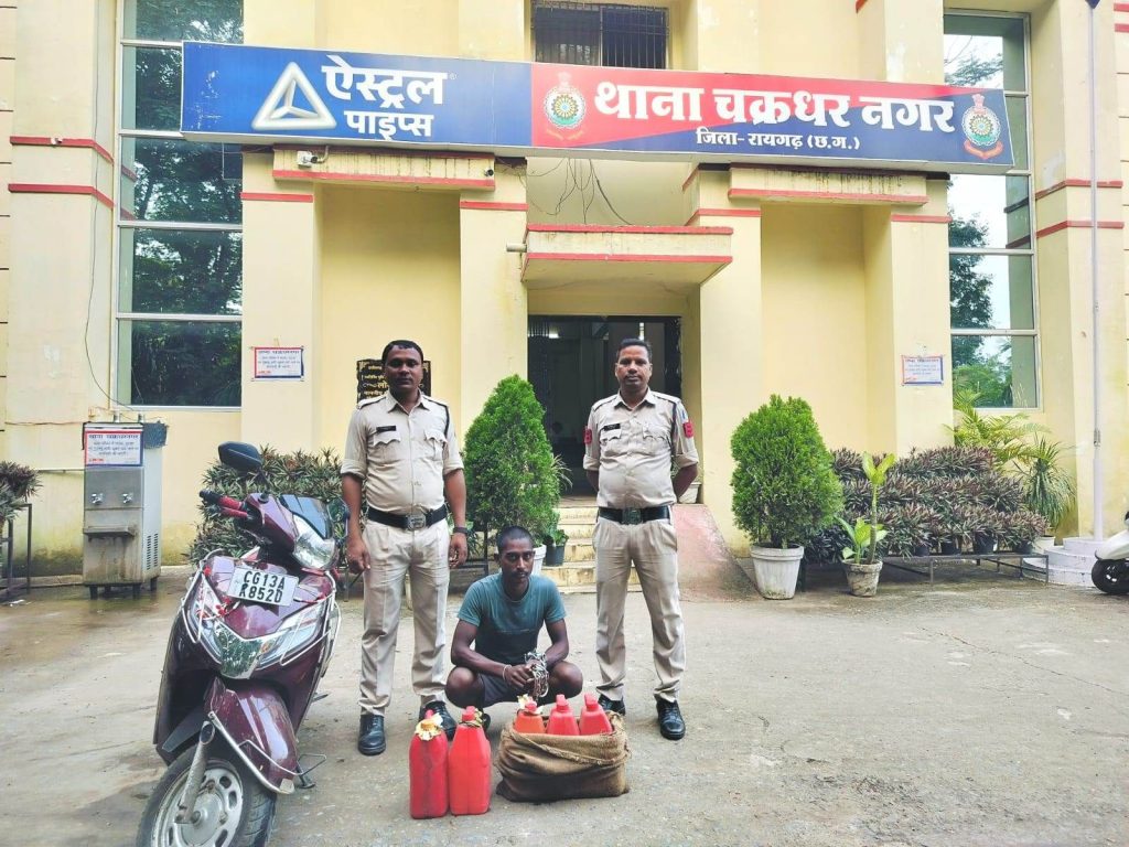 चक्रधरनगर पुलिस की शराब रेड कार्यवाही: स्कुटी पर शराब परिवहन कर रहा आरोपी गिरफ्तार, 25 लीटर महुआ शराब जप्त