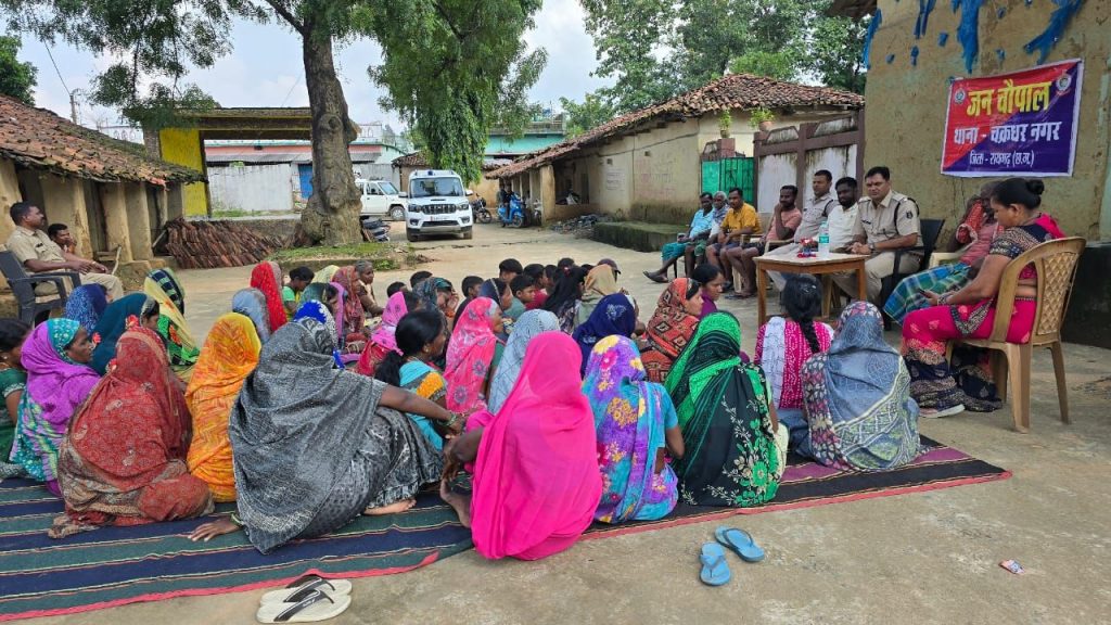 28 सितंबर, रायगढ़ । आज थाना प्रभारी चक्रधरनगर निरीक्षक प्रशांत राव आहेर के नेतृत्व में चक्रधरनगर पुलिस द्वारा ग्राम गोपालपुर में “पुलिस जनचौपाल” का आयोजन किया गया, जिसमें स्थानीय लोगों को विभिन्न अपराधों और सुरक्षा संबंधी मुद्दों पर जागरूक किया गया। इस अवसर पर साइबर क्राइम, महिला संबंधी अपराध, बाहरी व्यक्तियों से असुरक्षा, सोना-चांदी की सफाई के नाम पर ठगी, और बाहरी व्यक्तियों द्वारा गांव के समीप डेरा डालने और चोरी करने जैसी घटनाओं से सावधान रहने के लिए जागरूकता का प्रचार-प्रसार किया गया ।