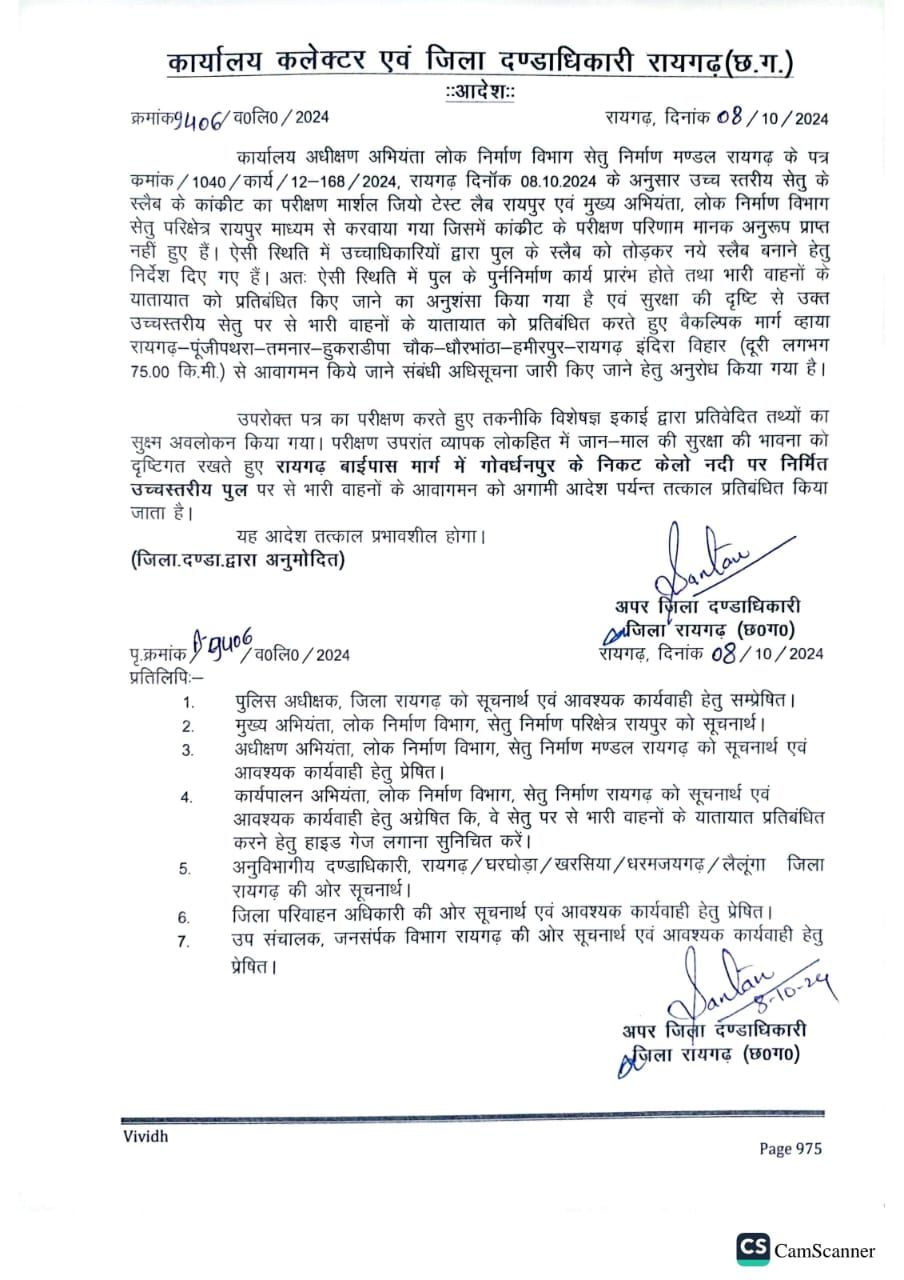 09 अक्टूबर, रायगढ़ । रायगढ़ बायपास मार्ग पर गोवर्धनपुर के समीप केलो नदी पर निर्मित उच्च स्तरीय पुल पर भारी वाहनों के आवागमन को तत्काल प्रभाव से प्रतिबंधित कर दिया गया है। इस संबंध में प्रशासन ने वैकल्पिक मार्ग का उपयोग करने की अधिसूचना भी जारी की है। यह निर्णय पुल की संरचनात्मक सुरक्षा को ध्यान में रखते हुए लिया गया है।