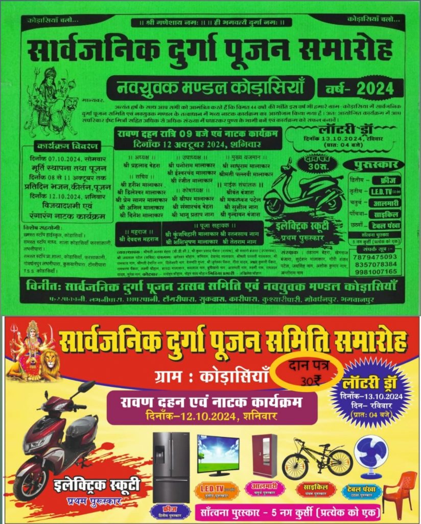 कोडासिया । लैलूंगा ब्लॉक में नवरात्रि पर्व की धूम मची हुई है इसी तारतम्य में लैलूंगा के ग्राम पंचायत कोडासियां में सार्वजनिक दुर्गा पूजन समिति एवं नवयुवक मंडल कोडासियां के द्वारा सार्वजनिक दुर्गा पूजन समारोह पिछले 44 वर्षो के तरह इस वर्ष भी आयोजित की गई है जिसमे मां दुर्गा की मूर्ति स्थापना कर हवन पूजन तथा सुबह शाम आरती की जाती है यहां कई आसपास के ग्रामवाशी भी आरती के लिए उपस्थित रहते हैं। इस कार्यक्रम से ग्राम में भक्तिमय माहौल बना हुआ है । यहां विजय दशमी में रावण दहन एवं रंगारंग नाटक का भी आयोजन किया जाता है जिसमे काफी संख्या में लोगों की भीड़ उमड़ती है तत्पश्चात मां दुर्गा जी की प्रतिमा विशर्जन कर कार्यक्रम का समापन किया जाता है । इस कार्यक्रम में बंपर लाटरी का भी आयोजन है जिसमे प्रथम पुरस्कार इलेक्ट्रिक स्कूटी, द्वितीय पुरुस्कार रेफ्रीजरेटर, तृतीय पुरस्कार एल इ डी टेलीविजन, चतुर्थ पुरस्कार अलमारी, पंचम पुरस्कार साइकिल और अन्य पुरस्कार भी रखा गया है जिससे लोगों में भरी उत्साह व्याप्त है ।