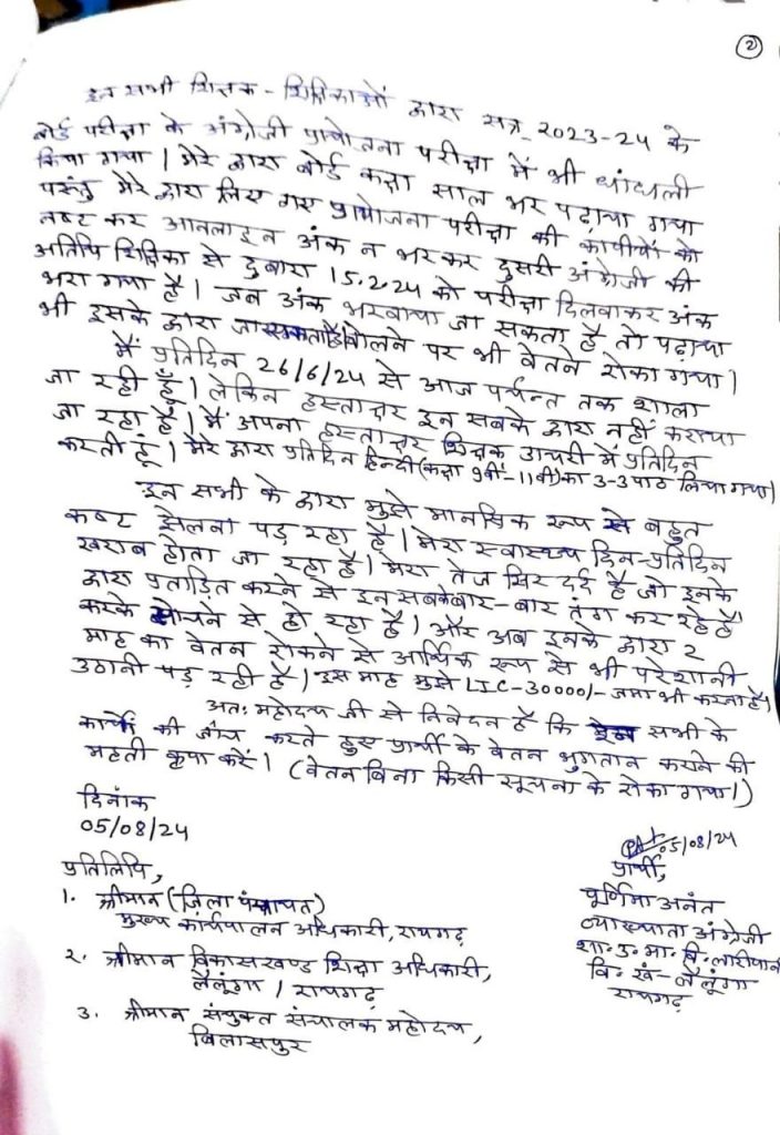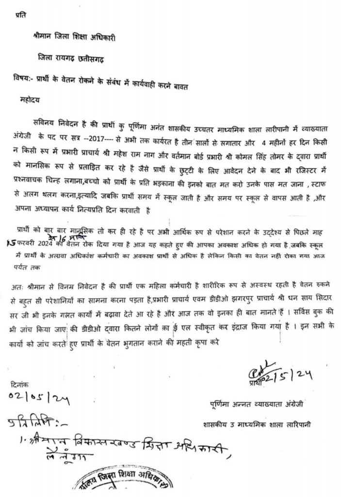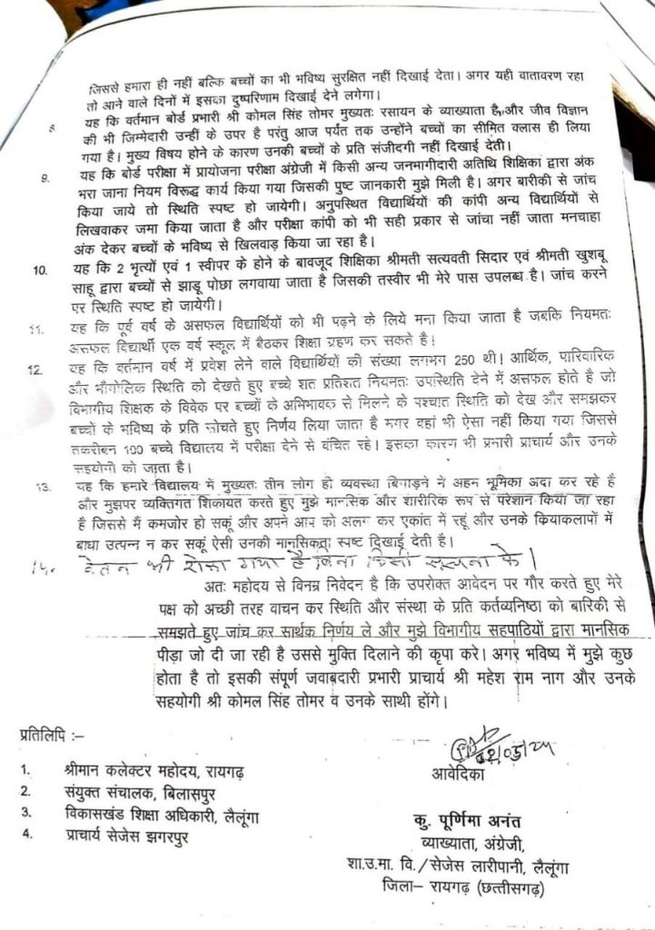 स्कूल के प्रभारी प्राचार्य अन्य स्टाफ के साथ तोमर सर की उनके प्रति व्यवहार ने उनको बहुत ही दुखी कर दिया है जिससे उनका स्वास्थ्य दिन प्रतिदिन मानसिक रूप से चिंतित है और विगत 9 माह से पूरा प्रयास किया जा रहा है वेतन रोकवाने का । ग्रीष्मकालीन अवकाश में भी अनुपस्थित किया गया जबकि उनके द्वारा निर्वाचन कार्य किया गया । विद्यार्थियों और अन्य स्टाफ को भी आने और बात करने से सबके द्वारा मना किया भी जाता है। तो मना किया जाता है तो पढ़ना पढ़ाना संभव कैसे होगा। तंग करने वाले कर्मचारी का नाम- बिंदु एक्का, कोमलसिंह तोमर,महेश राम नाग,सत्यवती सिदार,सहदेव साय,मंजू साहू ,वर्षा कौशिक,सुभाष चंद्र भोय