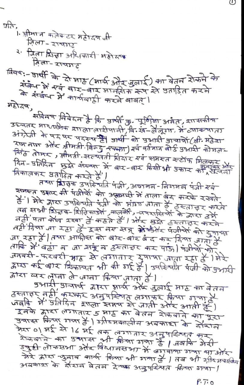 रायगढ़ :-वैसे तो शिक्षा की मंदिर बच्चों को उचित शिक्षा देना और उन्हें नए रास्ते दिखाकर राष्ट्र का निर्माण करना इत्यादि है लेकिन जिस स्कूल में बच्चों को शिक्षा देने वाले महिला शिक्षिका ही स्कूल के प्राचार्य और स्टाफ से प्रताड़ित हो उस स्कूल की बच्चों को उचित शिक्षा मिलने की कल्पना करना ही मूर्खता होगी ऐसे ही एक शिक्षक एक स्कूल है रायगढ़ जिले के लैलूंगा विकासखंड में जिसे पूर्ववर्ती सरकार ने बच्चों की अच्छा शिक्षा देने के उद्देश्य से स्वामी आत्मानंद के नाम से उन्नयन किया गया है बात हो रही है शासकीय उच्चतर माध्यमिक विद्यालय लारी पानी जहां पर पूर्व प्रभारी प्राचार्य श्री महेश राम नाग और वर्तमान प्रभारी प्राचार्य श्रीमती बिंदु एक्का एवं वर्तमान बोर्ड प्रभारी श्री कोमल सिंह तोमर के द्वारा संस्था में पदस्थ कुमारी पूर्णिमा अनंत जो व्याख्याता है अंग्रेजी विषय के शिक्षिका है और अनुसूचित जाति से है उक्त महिला शिक्षिका को प्रभारी प्राचार्य वा संस्था में पदस्थ अन्य स्टाफ सामान्य व्यवहार नहीं करते महिला शिक्षिका प्रतिदिन स्कूल शासन के निर्धारित समय पर पहुंच जाती है पर प्रभारी प्राचार्य के द्वारा उसे प्रताड़ित करने के उद्देश्य से शिक्षक उपस्थिति पंजी को या तो लाकर में बंद कर देती है या अपने साथ अपने निवास स्थान लेकर चली जाती है उनके द्वारा उपस्थिति पंजी की मांग करने पर प्राचार्य के द्वारा अन्य स्टाफ को मना किया जाता है सभी हमें नही पता कहते है। अपने पास नहीं होने की बात कहती हैं स्टाफ के अन्य साथियों से भी बात करने पर पंजी की जानकारी नहीं होना बताया जाता है जिस कारण से उपस्थिति स्कूलों में प्रमाणित नहीं हो पाती है वह प्रतिदिन बच्चों को अध्यापन कराती है डायरी मेंटेन करती है और निर्धारित समय तक स्कूल में रहकर अपनी कर्तव्यों का निर्वहन करती है जिसका प्रमाण संस्था के पढ़ाए गए बच्चे दे देंगे उसके बावजूद भी प्रभारी प्राचार्य वा अन्य स्टाफ के द्वारा क्यों इनके साथ भेदभाव करते हैं समझ से परे हैं वह स्कूल में अनुसूचित जाति महिला कर्मी के रूप में अकेली है क्या उनके साथ जातिगत दुर्भावना बस ऐसा किया जाता है या बात कुछऔर है या किसी के कहने से ऐसा किया जाता है प्रभारी प्राचार्य के द्वारा स्कूल फीस के नाम पर ,स्थानारण प्रमाण पत्र जारी करने के नाम पर,इंस्पायर अवार्ड के नाम पर पैसा लेना बच्चो का शोषण करना आम बात हो गई प्रभारी प्राचार्य के द्वारा अपने चहेते शिक्षक शिक्षिकाओं को मनचाहा छुट्टी देना पढ़ाई करने न करने पर भी कुछ नही कहना जैसे बातो को महिला शिक्षिका द्वारा विरोध करने पर देख लेने को धमकी दिया जाता है जबकि पीड़िता शिक्षिका का आवेदन देने पर भी पंजी में एंट्री ना करके अफसेंट लिखन