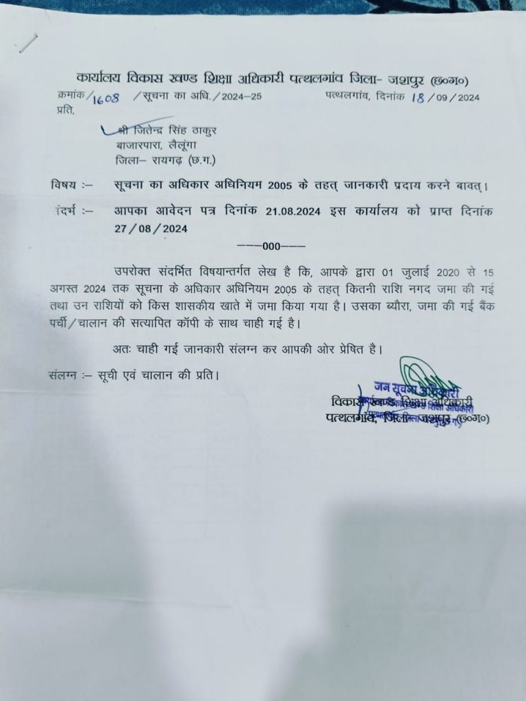 पत्थलगांव : यूं तो हमेशा सुर्खियों में रहने वाला विकास खण्ड शिक्षा अधिकारी कार्यालय पत्थलगांव के नित नए नए कारनामे सामने आते ही रहते हैं इसी कड़ी में एक और नए गबन का मामला प्रकाश में आया है जिसका खुलासा सूचना के अधिकार के तहत आवेदन देने पर आया है। विदित हो कि लैलूंगा निवासी जितेंद्र सिंह के द्वारा विकास खण्ड शिक्षा अधिकारी से दिनांक 21/08/2024 को आवेदन देकर मांग की गई थी कि विकास खण्ड कार्यालय में 01जुलाई 2020 से 15 अगस्त 2024 तक सूचना के अधिकारी आवेदन के द्वारा कितनी राशि प्राप्त हुई एवं प्राप्त राशियों को किस बैंक खाते में जमा किया गया।