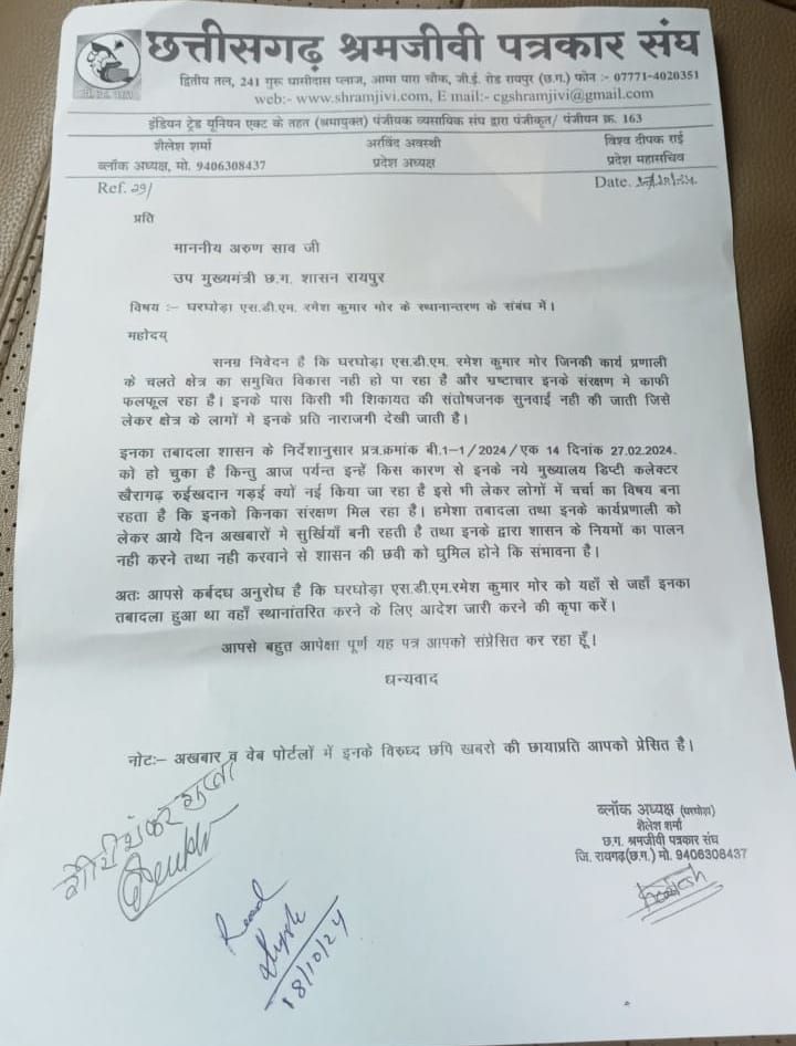 घरघोड़ा : ट्रांसफर के बाद भी घरघोड़ा एसडीएम के जमे रहने का मामले में सांसद के बाद अब डिप्टी सीएम के पास शिकायत, श्रमजीवी पत्रकार संघ ने की त्वरित कार्यवाही की मांग…