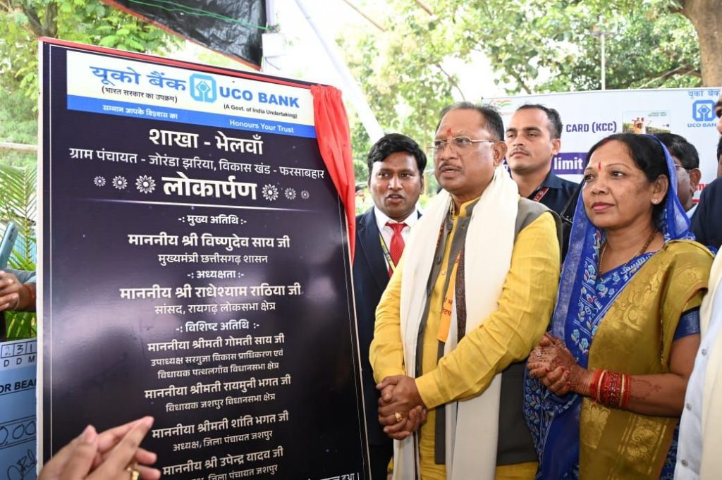 मुख्यमंत्री श्री विष्णु देव साय ने आज कैम्प कार्यालय बगिया में फरसाबहार विकास खंड के जोरण्डाझरिया ग्राम पंचायत के अन्तर्गत भेलवां की नई यूको बैंक की शाखा का शुभारंभ किया