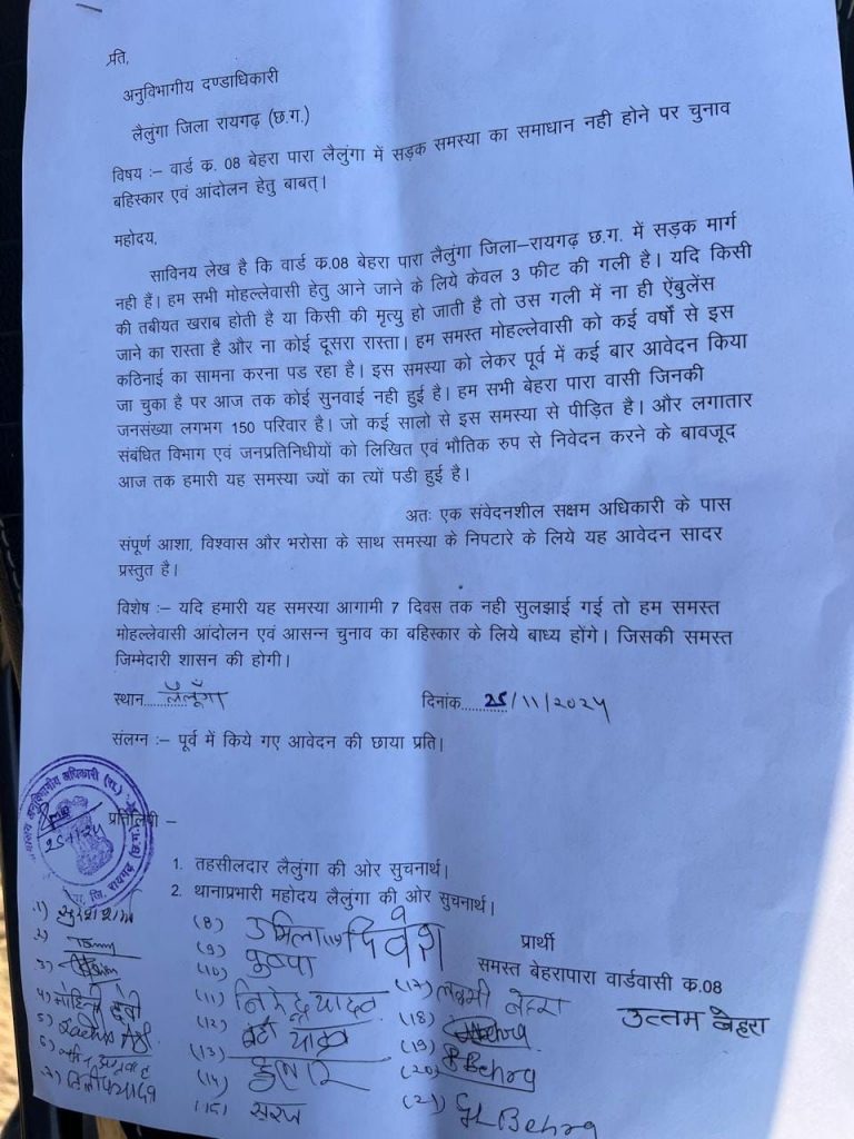 लैलूंगा के बेहरा पारा वार्ड क्रमांक 8 में सड़क समस्या का निजात नहीं होने पर चुनाव का होगा बहिस्कार