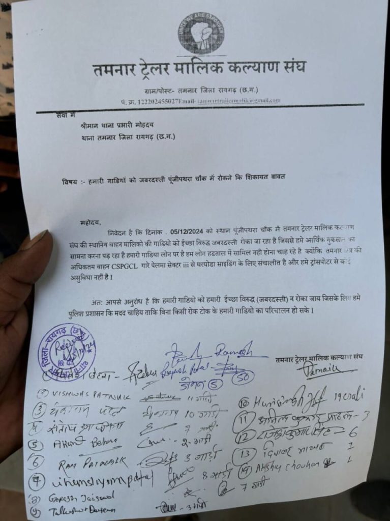 तमनार थाना प्रभारी को दिए गए शिकायत पत्र में बताया गया है कि पूंजीपथरा चौक में तमनार ट्रेलर मलिक कल्याण संघ की स्थानीय वाहन मालिकों की गाड़ियों को इच्छा विरुद्ध जबरदस्ती रोका जा रहा है, जिससे उन्हें आर्थिक नुकसान का सामना करना पड़ रहा है। तमनार टेलर यूनियन के सदस्यों का कहना है कि उनकी गाड़ियां लोन पर है,जिससे वे हड़ताल में शामिल होना नहीं चाहते हैं। तमनार क्षेत्र की अधिकतम वाहन सीएसपीजीसीएल गारे पेलमा सेक्टर 3 से घरघोड़ा साइडिंग के लिए संचालित है, और उन्हें ट्रांसपोर्टर से कोई असुविधा नहीं है।