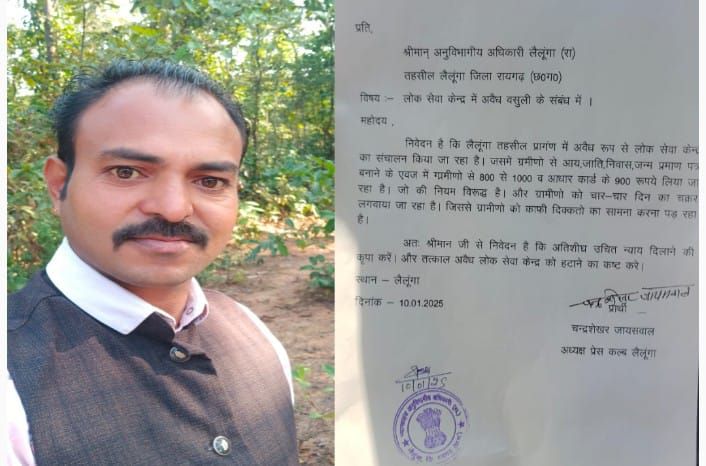 लैलूंगा :- रायगढ़ जिले के लैलूंगा विकासखंड अन्तर्गत सैकड़ों लोक सेवा केंद्र संचालित हो रहे हैं । जिसमें से पांच से अधिक लोक सेवा केंद्र अनुविभागीय अधिकारी लैलूंगा के कार्यालय से महज़ चंद कदमों पर संचालित हो रहे हैं । लोक सेवा केंद्र जहां पर जनता की सुविधा के लिए आय प्रमाण पत्र,जाति प्रमाण पत्र, निवासी प्रमाण पत्र, जन्म प्रमाण पत्र,B1 , नक्शा, खसरा एवं अन्य ऑनलाइन कार्य किए जाते है। जिनके लिए सरकार द्वारा निर्धारित शुल्क लिया जाता है । लेकिन आज के समय में लोक सेवा केंद्र अवैध वसूली का केंद्र बन चुका है । जिसकी समय समय पर प्रताड़ित लोगों द्वारा उच्च अधिकारीयों से शिकायत की जाती है । जनता के हित को ध्यान में रखते हुए लैलूंगा प्रेस क्लब के अध्यक्ष चंद्रशेखर जायसवाल ने अनुविभागीय अधिकारी लैलूंगा के समक्ष आवेदन प्रस्तुत किया है जिसमें लोक सेवा केंद्र आर. के. कंप्यूटर के खिलाफ़ शिकायत दर्ज कराई है कि इसके द्वारा आय जाति प्रमाण पत्र के नाम पर 1000 रुपए वसूली जा रही है वहीं आधार कार्ड बनाने के नाम पर 700 से 800 रुपए लिए जा रहे हैं । जो अवैधानिक है क्योंकि आधार कार्ड बनाने के लिए सरकार द्वारा 100 रुपए लिया जाना निर्धारित किया गया है । चंद्रशेखर जायसवाल द्वारा जांच करा कर जल्द कार्यवाही करने एवं अवैध लोक सेवा केंद्र को हटाने की मांग की गई है।अब देखना होगा कि शिकायत के बाद क्या कुछ कार्यवाही की जाती है ?