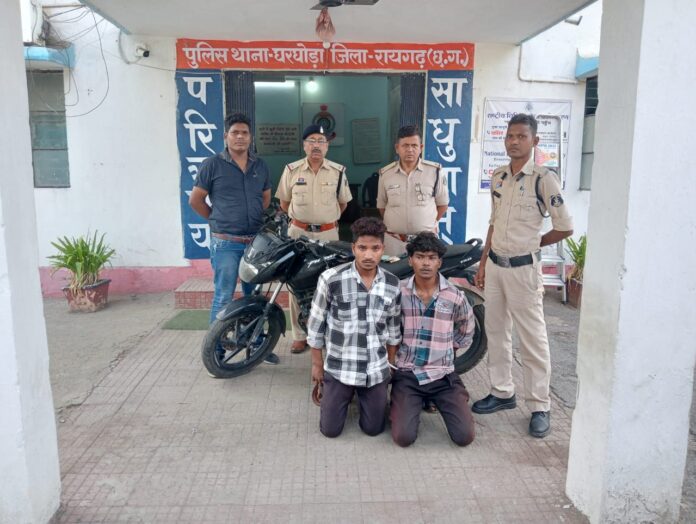 रायगढ़, 5 जून- घरघोड़ा थाना क्षेत्र में ट्रेलर वाहन चालक से मोबाइल और नगदी लूटकर फरार हुए दो आरोपियों को घरघोड़ा पुलिस ने त्वरित कार्रवाई करते हुए गिरफ्तार कर लिया है। निरीक्षक कुमार गौरव साहू के नेतृत्व में की गई इस कार्रवाई में न केवल लूटी गई सम्पत्ति बरामद हुई है, वारदात में प्रयुक्त मोटरसाइकिल भी जब्त कर ली गई है। दोनों आरोपियों को गिरफ्तार कर न्यायिक रिमांड पर भेज दिया गया है।