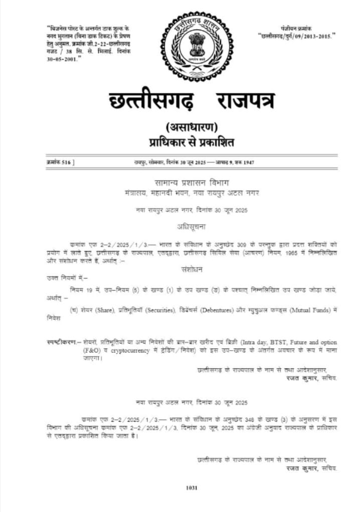 रायपुर, 5 जुलाई 2025 छत्तीसगढ़ सरकार ने एक ऐतिहासिक और सख्त निर्णय लेते हुए शासकीय कर्मचारियों की दोहरी ज़िंदगी पर करारा प्रहार किया है। अब यदि कोई सरकारी कर्मचारी शेयर बाज़ार, क्रिप्टो करेंसी या डेरिवेटिव ट्रेडिंग जैसी गतिविधियों में लिप्त पाया गया, तो उसे सिर्फ नोटिस या चेतावनी नहीं, बल्कि सीधी सेवा से बर्खास्तगी का सामना करना पड़ सकता है। यह निर्णय 30 जून 2025 को प्रकाशित राज्य शासन के राजपत्र क्रमांक 516 के माध्यम से लागू किया गया है।