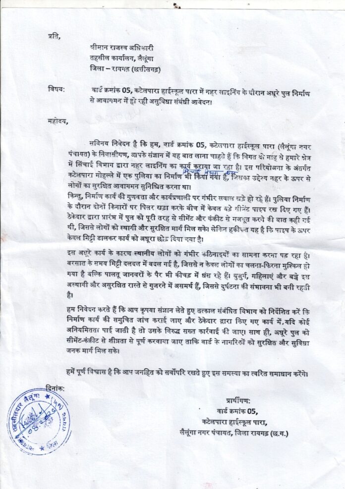 वार्डवासियों ने तहसील कार्यालय में एक आवेदन प्रस्तुत किया है, जिसमें उन्होंने मांग की है कि इस अधूरे और अव्यवस्थित पुल निर्माण की जांच कराई जाए, ठेकेदार द्वारा की गई लापरवाही के लिए सख्त कार्यवाही की जाए, और इस कार्य को सीमेंट-कंक्रीट से मजबूत कर पूर्ण किया जाए।