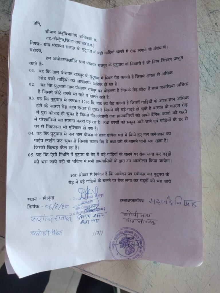 लैलूंगा/राजपुर : ग्राम पंचायत राजपुर के पुटूपारा मोहल्ले के निवासियों का आक्रोश अब सड़कों पर उतरने की कगार पर है। पुटूपारा की जर्जर कच्ची सड़कें, टूटी पाइपलाइन और भारी वाहनों की बेरोकटोक आवाजाही ने क्षेत्रवासियों की दिनचर्या को नरक बना दिया है। ग्रामीणों ने अनुविभागीय अधिकारी राजस्व, लैलूंगा को आवेदन सौंपते हुए तुरंत कार्यवाही की मांग की है, साथ ही चेतावनी दी है कि अगर जल्द समाधान नहीं हुआ तो पूरे गांव में उग्र आंदोलन छेड़ा जाएगा।