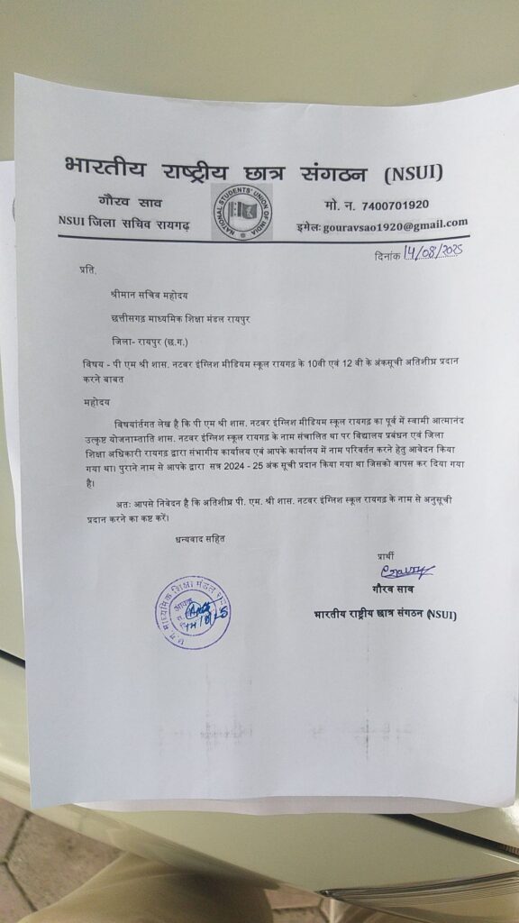 रायगढ़। जिले के पी.एम. श्री शासकीय नटवर इंग्लिश मीडियम स्कूल के 10वीं और 12वीं कक्षा के छात्रों की अंकसूचियां नाम परिवर्तन की प्रक्रिया में फंस गई हैं। इस मुद्दे को लेकर भारतीय राष्ट्रीय छात्र संगठन (NSUI) के जिला सचिव गौरव साव ने छत्तीसगढ़ माध्यमिक शिक्षा मंडल, रायपुर के सचिव को पत्र लिखकर शीघ्र कार्रवाई की मांग की है।