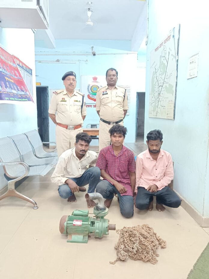 जांच के दौरान थाना प्रभारी निरीक्षक कुमार गौरव साहू को मुखबिर से सूचना मिली, जिस पर संदेह के आधार पर ग्राम चोटीगुडा निवासी तीन युवकों – गुरूचरण राठिया (28), संदीप पैकरा (26) और विद्याधर चौहान (29) को हिरासत में लेकर पूछताछ की गई। सख्ती से पूछताछ पर तीनों ने संयुक्त रूप से चोरी की वारदात को अंजाम देना स्वीकार किया। आरोपी गुरूचरण राठिया की निशानदेही पर एक्वाटेक्स कंपनी का 2 एचपी मोनोब्लॉक पंप, चैनपुली, एक ड्रम और पांच नग लोहे के पाइप बरामद किए गए, जिनकी अनुमानित कीमत 50 हजार रुपये है।