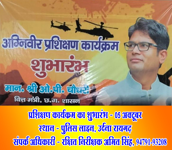 रायगढ़, 26 सितंबर । शासन की अहम अग्निवीर योजना में लिखित परीक्षा में चयनित अभ्यर्थियों के फिजिकल टेस्ट के पूर्व उन्हें पुलिस विभाग के ट्रेनर्स के द्वारा ट्रेनिंग दी जाएगी। इस संबंध में वित्त मंत्री ओपी चौधरी सर द्वारा अधिकारियों को निर्देश दिए गए हैं। जिला प्रशासन और पुलिस द्वारा “अग्निवीर” योजना में चयनित होने की तैयारी कर रहे युवाओं के लिए इस वर्ष भी पुलिस लाइन उर्दना में नि:शुल्क विशेष प्रशिक्षण शिविर आयोजित किया जावेगा ।