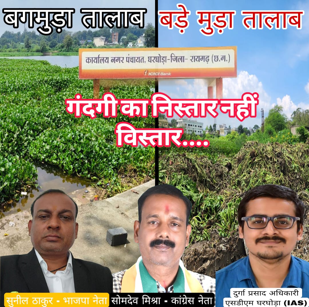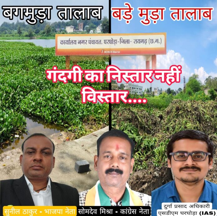 रायगढ़। एक तरफ देश भर में प्रधानमंत्री नरेंद्र मोदी के जन्मदिवस के अवसर से स्वच्छ भारत आरोग्य भारत का संदेश देने के लिए सेवा पखवाड़ा आयोजित किया गया है। भाजपा नेता, प्रशासनिक अधिकारी- कर्मचारी वर्ग जनहित में सफाई तथा अन्य कार्य कर रहे है। इसमे नगर पंचायत घरघोडा प्रशासन अपने ही ढ़र्रे में चलते हुए स्वच्छता अभियान की धज्जियां उड़ा रहा है, जिसमे स्वच्छता अभियान का बंटाधार एक तालाब से जलकुंभी निकालकर सड़क में बेतरतीब फेंक रहे है।