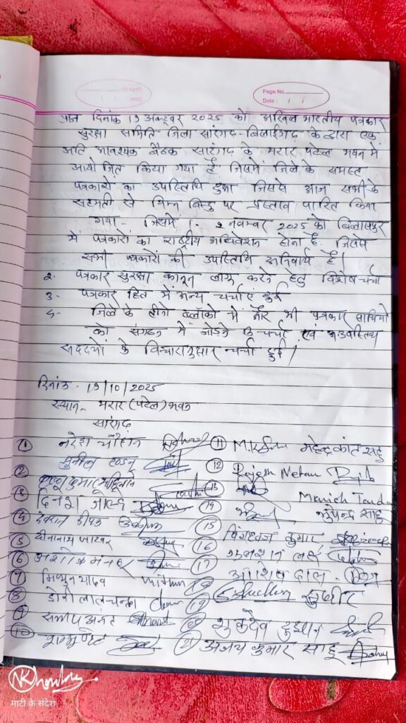 कार्यक्रम में विभिन्न ब्लॉकों से आए पत्रकारों ने अपने-अपने क्षेत्र की समस्याएँ भी साझा कीं। बैठक के अंत में यह निर्णय लिया गया कि सारंगढ़-बिलाईगढ़ जिले से पत्रकारों का एक प्रतिनिधिमंडल बिलासपुर अधिवेशन में शामिल होगा और पत्रकार सुरक्षा कानून की माँग को राष्ट्रीय स्तर पर मजबूती से रखेगा। मरार पटेल भवन में आयोजित इस बैठक में जिले के सैकड़ो पत्रकार मौजूद रहे और कार्यक्रम का संचालन श्याम कुमार पटेल द्वारा किया गया। बैठक का माहौल जोश और एकजुटता से भरा रहा, जहाँ हर कलमकार के चेहरे पर एक ही उम्मीद थी —