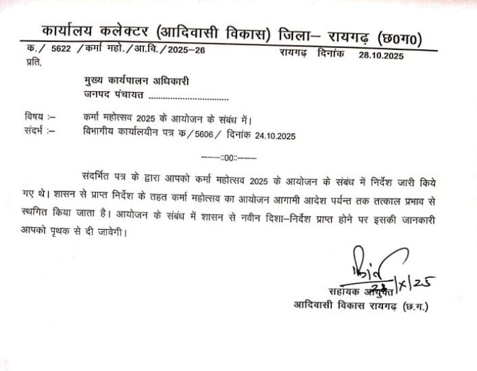 रायगढ़/लैलूंगा — जिलेभर में बड़े उत्साह और तैयारी के साथ मनाए जाने वाले कर्मा महोत्सव 2025 पर अचानक प्रशासनिक ब्रेक लग गया है। कार्यालय कलेक्टर (आदिवासी विकास) रायगढ़ द्वारा जारी पत्र क्रमांक क./5622/कर्मा महो./आ.वि./2025-26 दिनांक 28.10.2025 के माध्यम से इस वर्ष का कर्मा महोत्सव तत्काल प्रभाव से आगामी आदेश तक स्थगित कर दिया गया है।