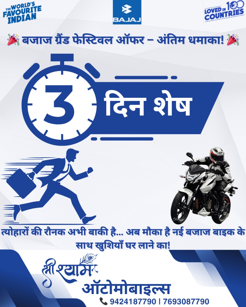 рдЧреНрд░рд╛рд╣рдХреЛрдВ рдХреЗ рд▓рд┐рдП рдЦреБрд╢рдЦрдмрд░реА тАФ рд╢реНрд░реА рд╢реНрдпрд╛рдо рдСрдЯреЛрдореЛрдмрд╛рдЗрд▓реНрд╕ рдореЗрдВ рдмрдЬрд╛рдЬ рдЧреНрд░реИрдВрдб рдлреЗрд╕реНрдЯрд┐рд╡рд▓ рдСрдлрд░ рдХреЗ рддрд╣рдд рдЕрдм рд╕рд┐рд░реНрдл 3 рджрд┐рди рд╢реЗрд╖ рд╣реИрдВред