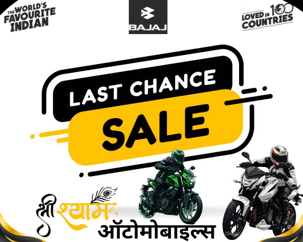 श्री श्याम ऑटोमोबाइल्स, लैलुंगा में शुरू हुई है बजाज की “Last Chance Sale”, जहां मिल रहे हैं धमाकेदार डिस्काउंट और बेजोड़ फाइनेंस सुविधाएं।