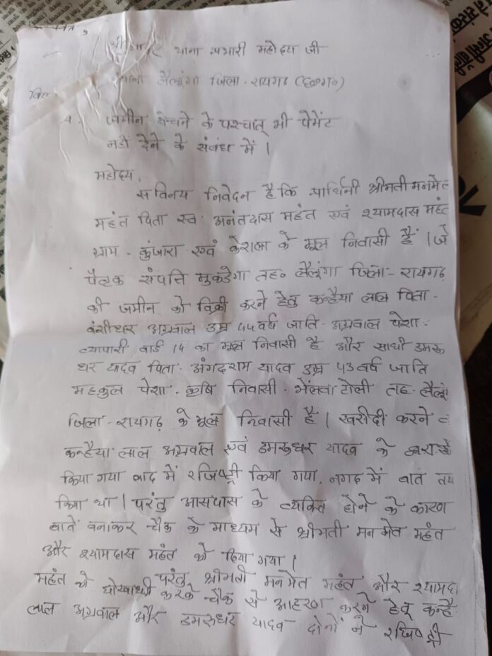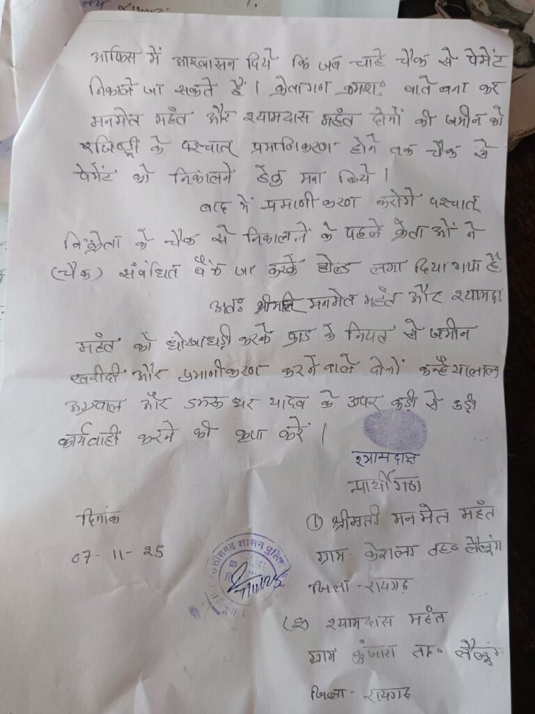 रायगढ़। लैलूंगा क्षेत्र में जमीन के नाम पर हुए ताजा घोटाले ने पूरे इलाके में सनसनी फैला दी है। ग्राम कुंजारा और केसला के ग्रामीण आज भी न्याय की आस में भटक रहे हैं। दरअसल, श्रीमती मनमेत महंत और श्यामदास महंत ने अपनी पैतृक जमीन बेच तो दी, लेकिन खरीददारों ने उन्हें अब तक भुगतान नहीं किया। इस पूरे मामले में स्थानीय व्यापारी कन्हैयालाल अग्रवाल (55 वर्ष) और डमरुधर यादव (43 वर्ष) पर गंभीर आरोप लगे हैं कि उन्होंने चालाकी से जमीन अपने नाम करा ली और बाद में चेक को ‘होल्ड’ करवा दिया।