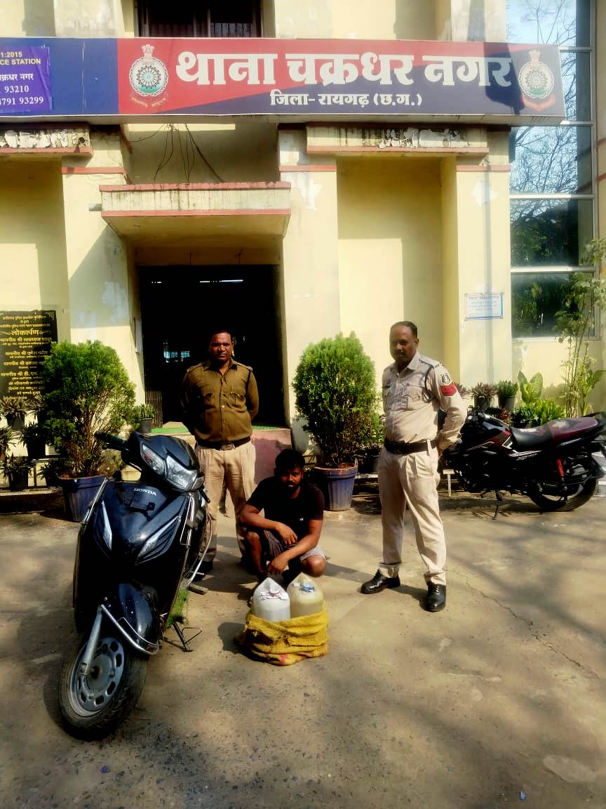 रायगढ़, 16 नवंबर । कल दिनांक 15.11.2025 को चक्रधरनगर पुलिस ने स्कूटी में महुआ शराब परिवहन कर बिक्री की तैयारी में निकले एक युवक को घेराबंदी कर पकड़ लिया।