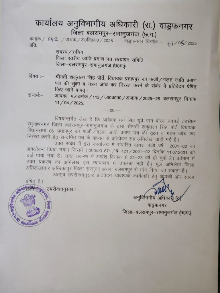 फिलहाल संपूर्ण मामला जिला स्तरीय जाति प्रमाण-सत्यापन समिति के पास सुरक्षित है। अधिकारी पुराने रिकॉर्ड और अभिलेखों के आधार पर मामले की गहराई से जांच कर रहे हैं।