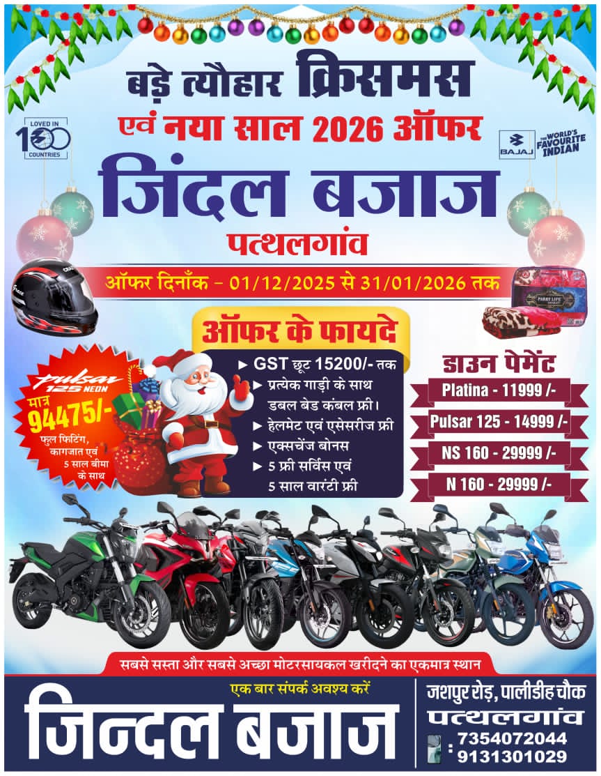 दिसंबर का महीना अगर आप नई या पुरानी बाइक लेने की प्लानिंग में हैं तो ये खबर आपके लिए किसी बंपर जैकपॉट से कम नहीं। जिंदल बजाज, पालीडीह चौंक पत्थलगांव ग्राहकों के लिए लेकर आया है ऐसा ऑफर जिसे देख कर हर बाइकर बोलेगा – “वाह! ये सौदा तो हाथों-हाथ लपकने लायक है!”