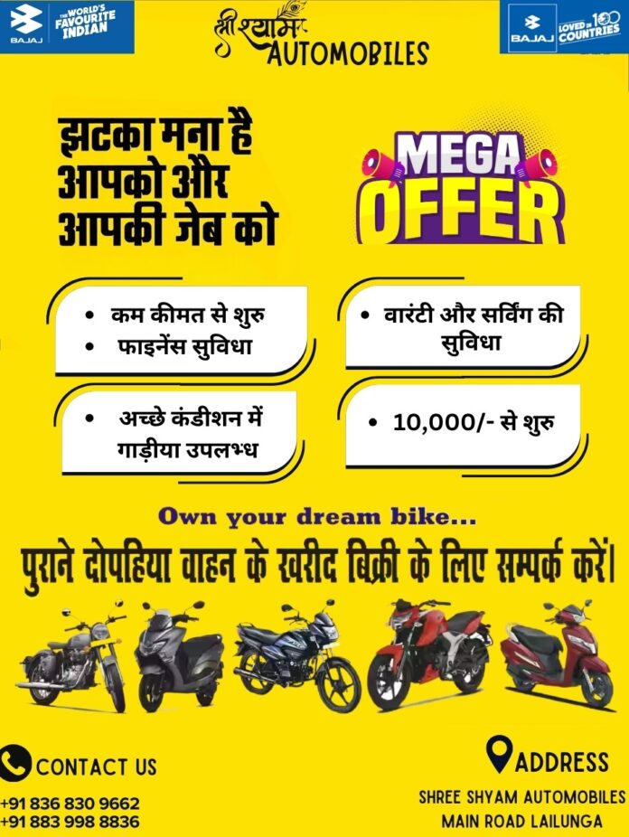 लैलूंगा। क्षेत्र के प्रतिष्ठित वाहन विक्रेता Shree Shyam Automobiles द्वारा आम ग्राहकों की जरूरतों को ध्यान में रखते हुए भव्य ‘परिवहन मेला’ का आयोजन किया गया है। इस मेले में सभी प्रमुख कंपनियों की सेकंड हैंड बाइक एवं स्कूटी बेहतरीन कंडिशन में मात्र ₹10,000/- से शुरुआती कीमत पर उपलब्ध कराई जा रही हैं। यह मेला खास तौर पर उन लोगों के लिए सुनहरा अवसर है, जो कम बजट में भरोसेमंद वाहन खरीदने की योजना बना रहे हैं।