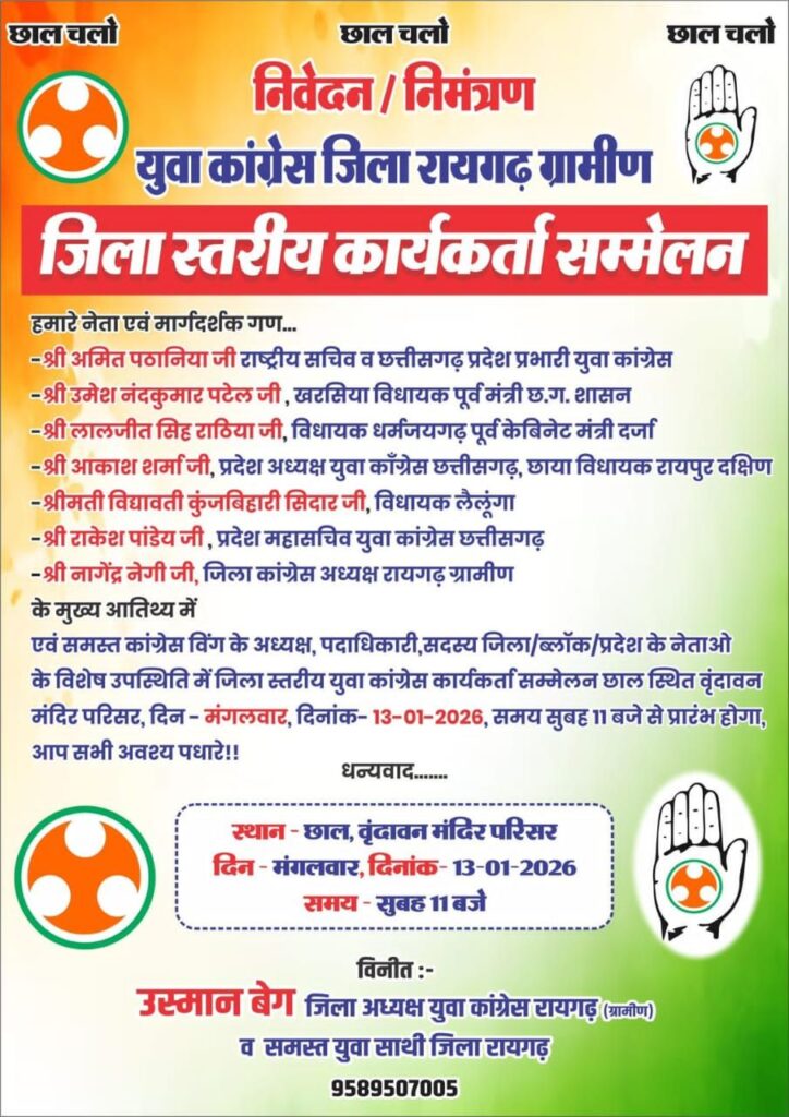 छत्तीसगढ़ रायगढ़ लैलूंगा छाल तमनार अम्बिकापुर जशपुरनगर बलौदाबाजार बिलासपुर महासमुंद सक्ति सारंगढ़-बिलाईगढ़ कोतबा कोरबा खरसिया जांजगीर चांपा डभरा पिथौरा रायपुर लैलूंगा जिला स्तरीय यूथ कांग्रेस कार्यक्रम छाल वृन्दावन के लिए लैलूंगा यूथ कांग्रेस और NSUI की टीम रवाना हुई चंद्रशेखर जायसवाल January 13, 2026 275 जिला स्तरीय यूथ कांग्रेस कार्यक्रम छाल वृन्दावन के लिए लैलूंगा यूथ कांग्रेस और NSUI की टीम रवाना हुई CGLIVE24NEWS छत्तीसगढ़ लाईव24 न्यूज़ पोर्टल एवं यूट्यूब चैनल है जिसका मुख्य उद्देश्य क्षेत्र की घटनाक्रम, सामाजिक मुद्दा ,राजनीतिक गतिविधि एवं सांस्कृतिक धरोहर, जनसरोकार के मुद्दों को लेकर समाज के सामने दिखाना हमारा मुख्य उद्देश्य है। संपादक-चंद्रशेखर जायसवाल मोबाईल-9340765733,9165043133 YouTube Video UCEwCsS3f5YEF_-0A1uOzO-g_uEfhmtGzQG4 लमडांड छात्रावास में धुआंधार कार्यक्रम: स्वेटर वितरण के साथ गूंजा पर्यावरण संरक्षण का संदेश मुख्यमंत्री श्री विष्णुदेव साय ने जशपुर प्रवास के दौरान नवीन अपराधिक कानून के स्टाॅल का अवलोकन रायगढ़ जिले की कानून-व्यवस्था पर कलेक्टर सख़्त– लंबित प्रकरण जल्द निपटाने और संवेदनशील व्यवस्थाओ प्रतापपुर विधायक शकुंतला सिंह पोर्ते पर फर्जी जाति प्रमाण पत्र का संगीन आरोप, आदिवासी Jashpur##@ गौ तस्कर गए जेल देखिये कैसे ले जाते है लैलूंगा के बसंतपुर में सांसद खेल महोत्सव का महाधमाका — मैदान गूंजा, भीड़ उमड़ी, युवा जोश का Jashpur## रुपये मांगना पड़ा महंगा गया जेल Raigarh## यातायात पुलिस की ताबड़तोड़ कार्यवाही Lailunga ## सुबरा पुलिया में एक्सीडेंट अपना न्यूज़ पोर्टल - 9340765733 Share FacebookTwitterWhatsAppTelegramCopy URL Recent Posts CG : एक महीने से लापता रहने वाले पटवारी पर प्रशासन का एक्शन, तत्काल प्रभाव से किए गए निलंबित छत्तीसगढ़ चंद्रशेखर जायसवाल - March 29, 2026 0 बलौदाबाजार। राजस्व विभाग में लापरवाही बरतने वाले एक पटवारी पर प्रशासन ने सख्त कार्रवाई की है। लंबे समय से बिना सूचना ड्यूटी से गायब रहने... समाज की प्रगति ही राष्ट्र की उन्नति का आधार – मंत्री टंकराम वर्मा छत्तीसगढ़ चंद्रशेखर जायसवाल - March 29, 2026 0 मुख्यमंत्री विष्णु देव साय ने इचकेला की बालिका क्रिकेट खिलाड़ियों को किया सम्मानित: क्रिकेट किट प्रदान कर बढ़ाया उत्साह रायपुर चंद्रशेखर जायसवाल - March 29, 2026 0 CM साय ने सुनी ‘मन की बात’ की 132वीं कड़ी; जल संरक्षण में छत्तीसगढ़ बना देश के लिए मिसाल: कोरिया के जल संरक्षण मॉडल... Uncategorized चंद्रशेखर जायसवाल - March 29, 2026 0 असम के तैराकों ने राज्यपाल डेका से की सौजन्य भेंट छत्तीसगढ़ चंद्रशेखर जायसवाल - March 29, 2026 0 सुकमा में एक नक्सली ढेर, पोलमपल्ली के जंगल में मुठभेड़ हुई छत्तीसगढ़ चंद्रशेखर जायसवाल - March 29, 2026 0 Load more