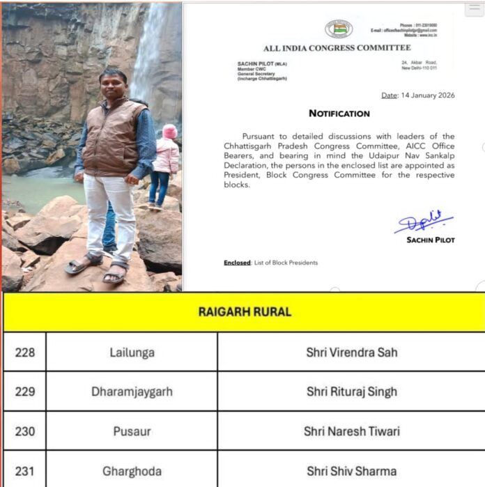 लैलूंगा /भारतीय राष्ट्रीय कांग्रेस संगठन ने छत्तीसगढ़ में संगठनात्मक मजबूती की दिशा में एक और अहम कदम उठाते हुए लैलूंगा ब्लॉक कांग्रेस कमेटी की कमान वीरेंद्र साव को सौंप दी है। अखिल भारतीय कांग्रेस समिति (AICC) की ओर से जारी अधिसूचना में यह घोषणा की गई, जिस पर छत्तीसगढ़ प्रभारी, कांग्रेस महासचिव एवं सीडब्ल्यूसी सदस्य सचिन पायलट के हस्ताक्षर हैं। इस नियुक्ति के बाद लैलूंगा सहित पूरे क्षेत्र में कांग्रेस कार्यकर्ताओं में उत्साह की लहर दौड़ गई है।