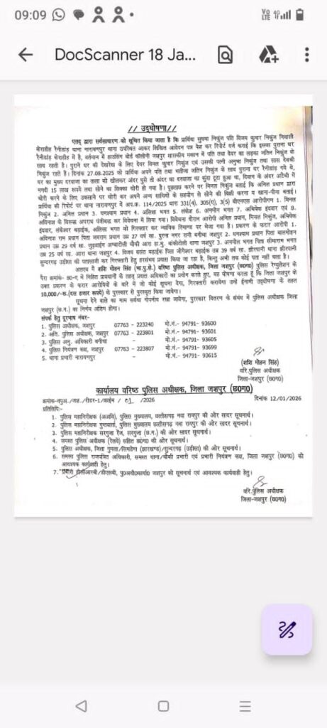 ➡️ इसी क्रम में वरिष्ठ पुलिस अधीक्षक जशपुर शशि मोहन सिंह के द्वारा पुलिस रेग्यूलेशन पैरा 80- ए में निहित प्रावधानों के तहत प्रदत्त अधिकारों का प्रयोग करते हुए उद्घोषणा जारी की गई है कि उक्त फरार आरोपियों के संबंध में जो कोई सूचना देगा, गिरफ्तारी कराएगा, उसका नाम सर्वथा गोपनीय रखते हुए,उसे 10,000 रु ( दस हजार रुपए) ईनाम से पुरस्कृत किया जाएगा।