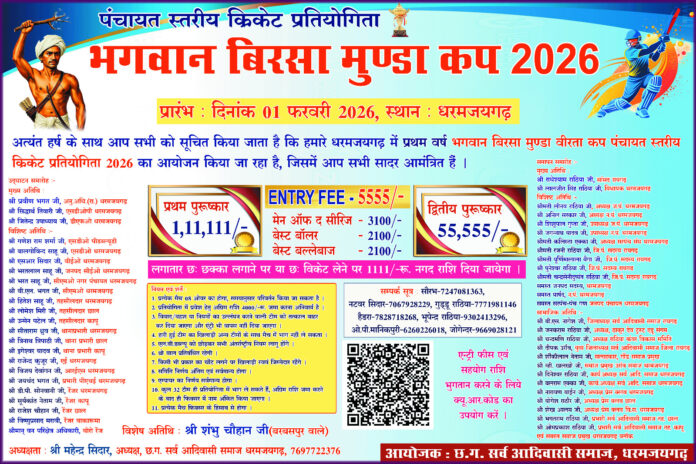 रायगढ़/धर्मजयगढ़ की पावन धरा पर आगामी 1 फरवरी 2026 से ‘भगवान बिरसा मुण्डा कप’ पंचायत स्तरीय क्रिकेट प्रतियोगिता का भव्य आयोजन होने जा रहा है।