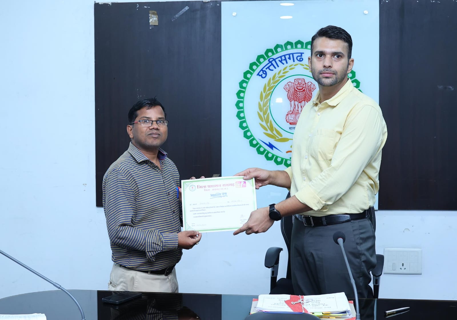 रायगढ़, 3 फरवरी 2026/ राज्य शासन की जनकल्याणकारी योजनाओं को जमीनी स्तर पर प्रभावी ढंग से क्रियान्वित करने वाले कर्मठ शासकीय सेवकों के उत्साहवर्धन हेतु प्रारंभ की गई अभिनव पहल के अंतर्गत आज कलेक्टर श्री मयंक चतुर्वेदी ने उत्कृष्ट कार्य करने वाले कर्मचारियों को सम्मानित किया। जिला कलेक्ट्रेट सभाकक्ष में आयोजित कार्यक्रम में कलेक्टर ने विभिन्न विभागों के लगभग एक दर्जन कर्मचारियों को उनके उल्लेखनीय कार्य, कर्तव्यनिष्ठा एवं समर्पण के लिए प्रशस्ति पत्र प्रदान कर सम्मानित किया।