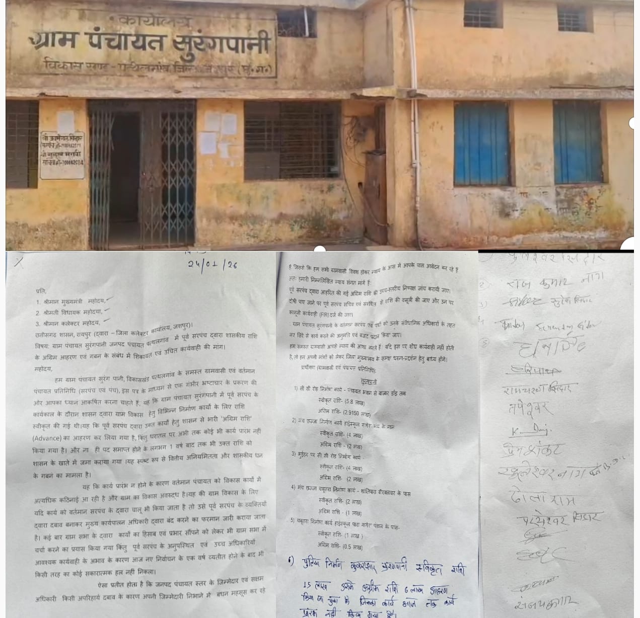 जशपुर / पत्थलगांव विकासखंड अंतर्गत ग्राम पंचायत सुरंगपानी में भ्रष्टाचार का एक ऐसा मामला सामने आया है जिसने पूरे क्षेत्र को झकझोर कर रख दिया है। ग्राम विकास के नाम पर शासन से स्वीकृत लाखों रुपये की राशि को पूर्व सरपंच द्वारा अग्रिम रूप से आहरित कर लिया गया, लेकिन धरातल पर आज तक कोई निर्माण कार्य प्रारंभ नहीं किया गया। ग्रामीणों का आरोप है कि पंचायत में विकास कार्यों को रोककर शासकीय धन का खुला गबन किया गया है।