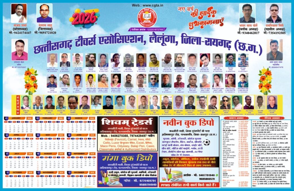 छत्तीसगढ़ टीचर्स एसोसिएशन के कैलेंडर में छत्तीसगढ़ टीचर्स एसोसिएशन के पदाधिकारियों की जानकारी, नूतन वर्ष 2026 की शुभकामना, शासकीय अवकाश, स्थानीय अवकाश रायगढ़ जिला, ऐच्छिक अवकाश की जानकारी सहित वर्ष 2026 का कैलेंडर समाहित है।