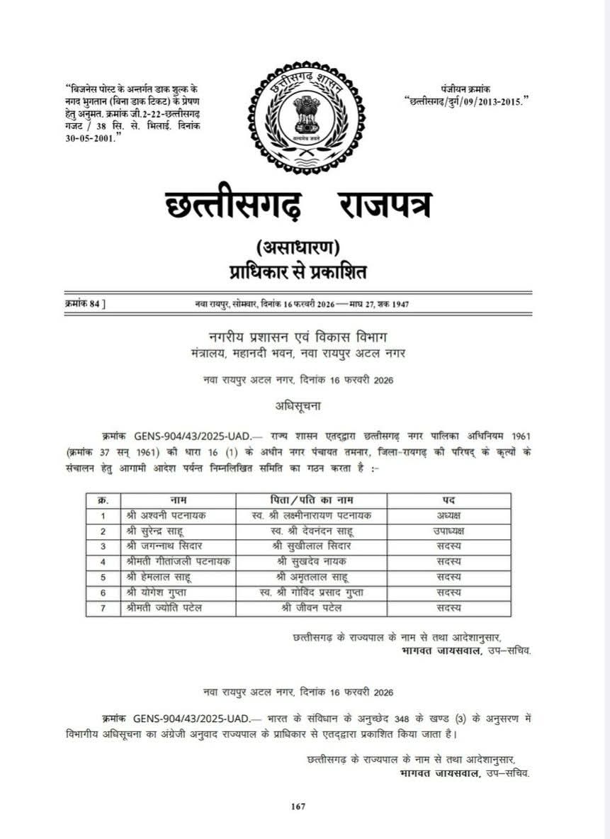 नवा रायपुर, 16 फरवरी 2026: छत्तीसगढ़ शासन के नगरीय प्रशासन एवं विकास विभाग द्वारा आज एक महत्वपूर्ण अधिसूचना जारी की गई है। राज्य सरकार ने ‘छत्तीसगढ़ नगर पालिका अधिनियम 1961’ की धारा 16 (1) के तहत प्रदत्त शक्तियों का प्रयोग करते हुए नगर पंचायत तमनार (जिला-रायगढ़) के कार्यों के संचालन के लिए एक नई समिति का गठन किया है।
