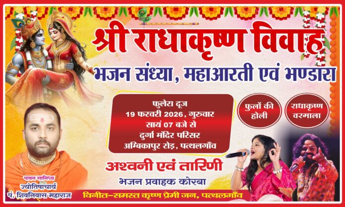 प्रतिवर्ष की भांति इस वर्ष भी समस्या कृष्ण प्रेमी जन पत्थलगांव के द्वारा इस वर्ष भी फुलेरा दूज के उपलक्ष में 19 फरवरी 2026 दिन गुरुवार को श्री राधाकृष्ण विवाह का भव्य आयोजन श्री दुर्गा मंदिर (अंबिकापुर रोड) पत्थलगांव में श्री राधाकृष्ण भगवान के श्री विग्रह के समक्ष निश्चित किया गया है । इस वर्ष छत्तीसगढ़ के मशहूर भजन प्रवाहक अश्विनी श्रीवास एवं भजन प्रवाहिका तारिणी , भगवान श्री राधा कृष्ण के विवाह को और भी उत्साह पूर्ण बनाने के लिए पत्थलगांव की पावन धर्म नगरी में पधार रहे हैं । इस आयोजन में 19 फरवरी 2026 दिन गुरुवार को सायं 07:00 बजे से भजन संध्या प्रारंभ हो जाएगी एवं कार्यक्रम जब आध्यात्मिकता के चरम सीमा पर पहुंचेगी उस समय भगवान श्री राधा कृष्ण का वरमाला होना निश्चित हुआ है। तत्पश्चात फूलों की होली भगवान श्री राधा कृष्ण की पावन दिव्य महा आरती एवं कार्यक्रम के समापन के साथ भव्य एवं दिव्य भंडारे का आयोजन भगवान श्री कृष्ण की रसोई से संपन्न किया जाएगा । सभी नगरवासियों से समाज के वरिष्ठ जन सेवक एवं प्रतिष्ठित व्यवसाई जन इस भव्य एवं दिव्य कार्यक्रम में सम्मिलित होने के लिए अपील कर रहे हैं । प्रतिवर्ष इस कार्यक्रम की दिव्यता और भी बढ़ती जा रही है , इस वर्ष कार्यक्रम की भव्यता-दिव्यता और भी अधिक होने की संभावना है…!!