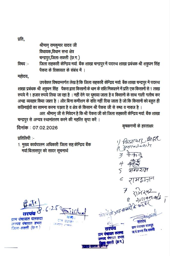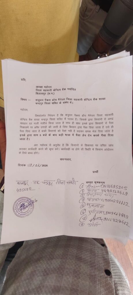 जिला सहकारी केंद्रीय बैंक मर्यादित, जिला सहकारी केंद्रीय बैंक मर्यादित बिलासपुर के जनपद क्षेत्र में पदस्थ एक शाखा प्रबंधक के खिलाफ किसानों ने गंभीर आरोप लगाए हैं। किसानों द्वारा अध्यक्ष को सौंपे गए लिखित ज्ञापन में शत्रुघन पैंकरा, शाखा प्रबंधक, चन्द्रपुर, जिला सक्ती पर दुर्व्यवहार, अपमानजनक भाषा के प्रयोग और वित्तीय लेनदेन में अनियमितता के आरोप लगाए गए हैं।