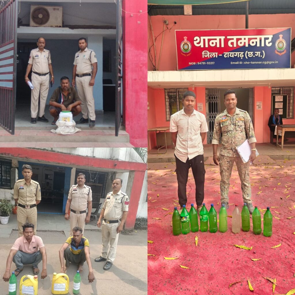 तमनार, चौकी खरसिया और भूपदेवपुर क्षेत्र में पुलिस की दबिश, 4 आरोपियों के कब्जे से अवैध महुआ शराब बरामद