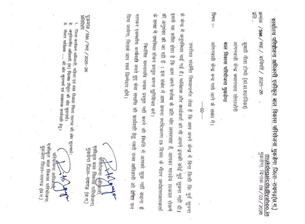 मामला मीडिया में सामने आने के बाद कार्यालय परियोजना अधिकारी, एकीकृत बाल विकास परियोजना मुकडेगा, जिला रायगढ़ ने तत्काल कार्रवाई करते हुए आंगनबाड़ी सहायिका कुमारी नीता टोप्पो को कारण बताओ नोटिस जारी किया है। नोटिस में स्पष्ट उल्लेख किया गया है कि सहायिका अपने केंद्र में बिना किसी पूर्व सूचना के अनुपस्थित पाई गईं, जिसकी जानकारी उन्होंने न तो पर्यवेक्षक को दी और न ही कार्यकर्ता को।