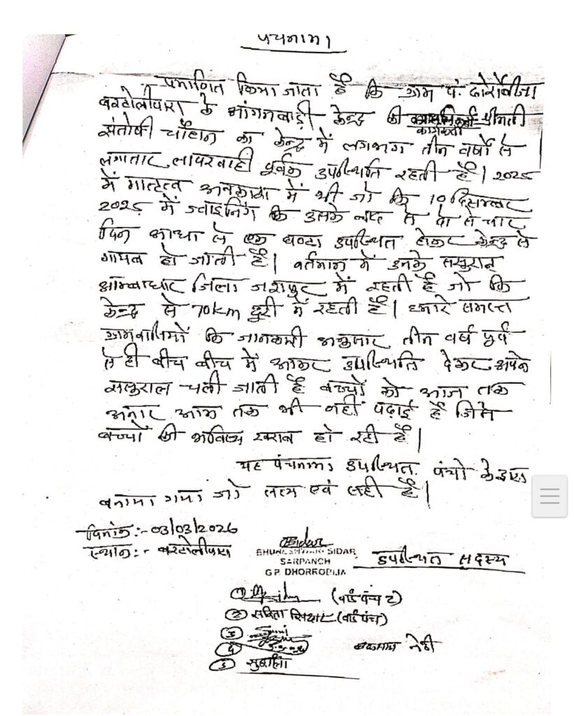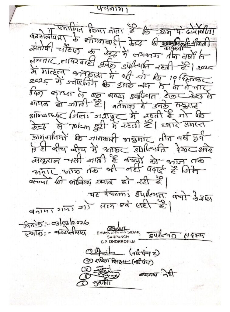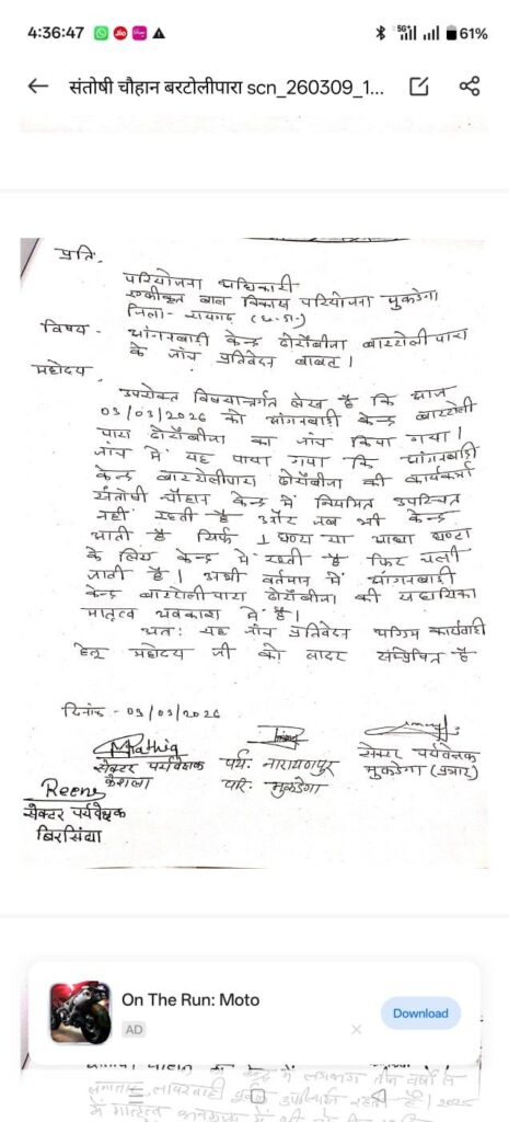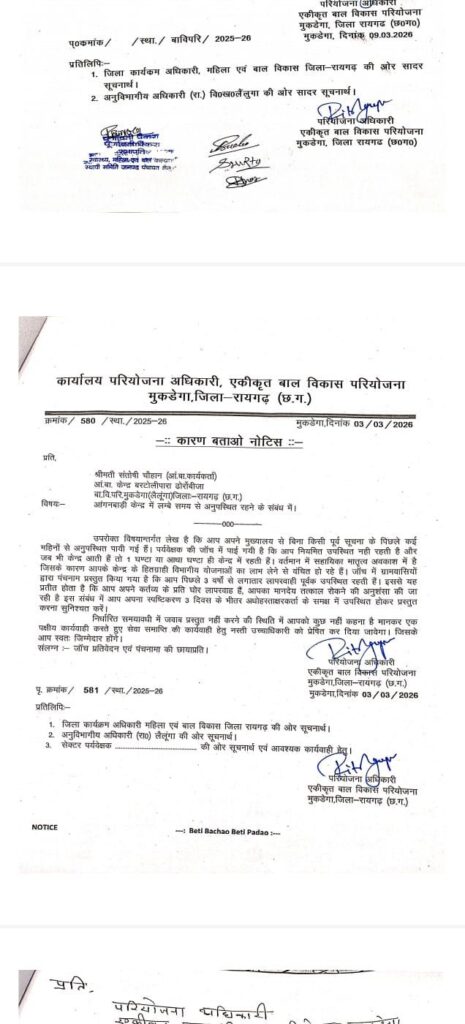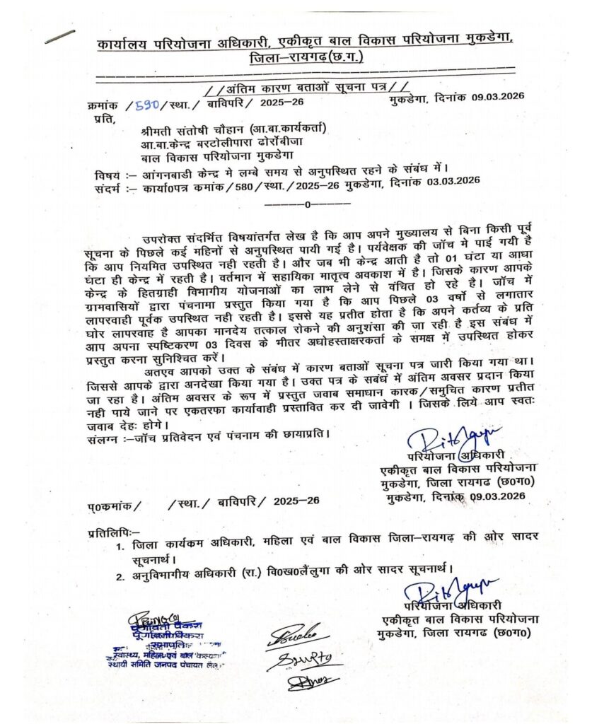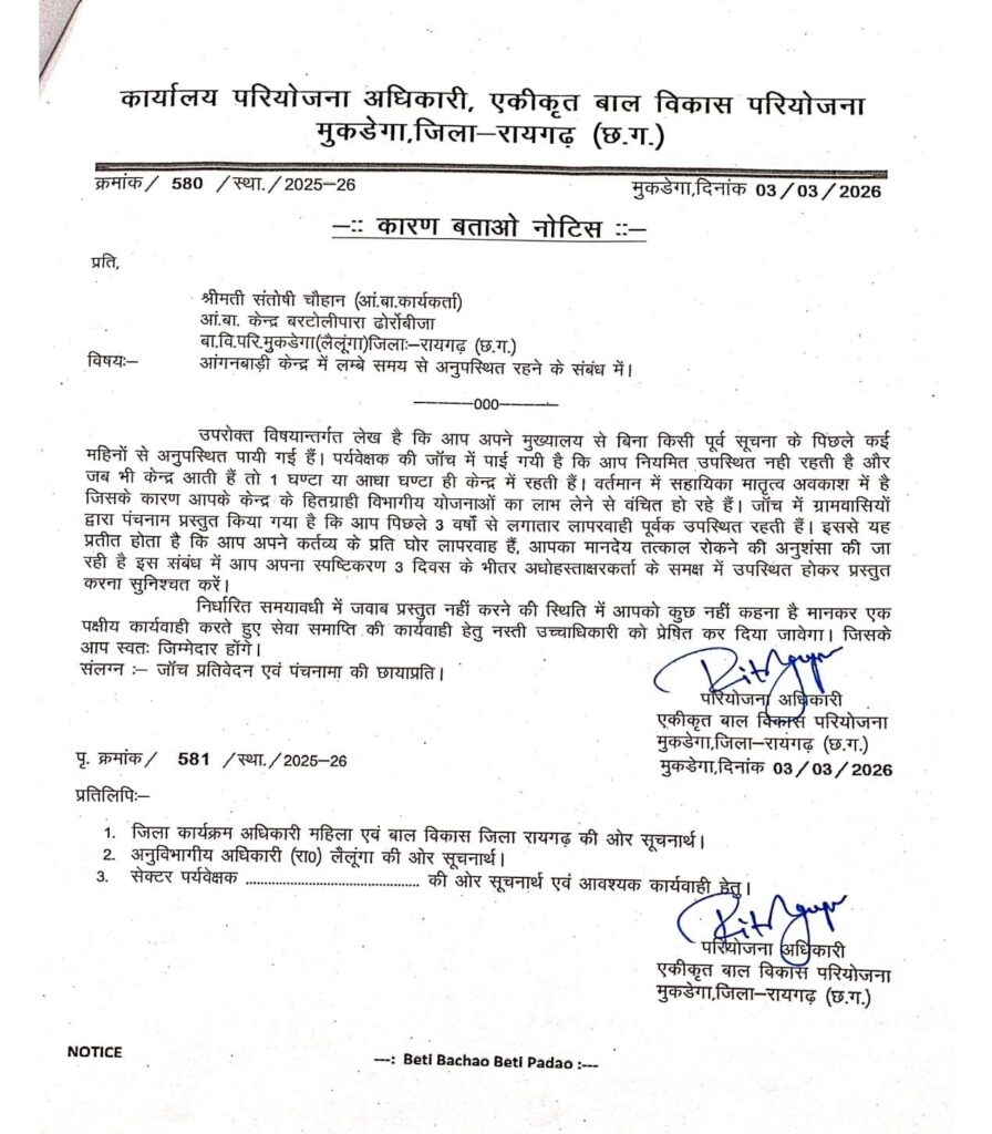 मुकडेगा परियोजना कार्यालय से जारी पत्र क्रमांक 590/स्था./बविपरि/2025-26 दिनांक 09 मार्च 2026 के अनुसार बरटोलीपारा ढोरोंबीजा की आंगनबाड़ी कार्यकर्ता श्रीमती संतोषी चौहान लंबे समय से अपने मुख्यालय से बिना सूचना के अनुपस्थित पाई गई हैं। विभागीय जांच में यह भी सामने आया है कि कार्यकर्ता नियमित रूप से केंद्र में उपस्थित नहीं रहती थीं और जब भी केंद्र आती थीं तो केवल आधा घंटा या एक घंटे के लिए ही रुकती थीं।
