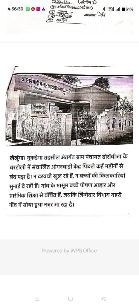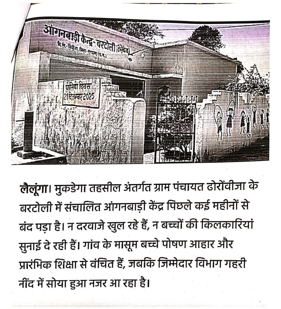 लैलूंगा। ग्राम पंचायत ढोरोंवीजा के बरटोली पारा आंगनबाड़ी केंद्र के महीनों से बंद रहने की खबर CG LIVE 24 NEWS में प्रमुखता से प्रकाशित होने के बाद प्रशासन हरकत में आ गया है। खबर सामने आते ही महिला एवं बाल विकास विभाग ने मामले को गंभीरता से लेते हुए आंगनबाड़ी कार्यकर्ता को अंतिम कारण बताओ नोटिस जारी कर दिया है।