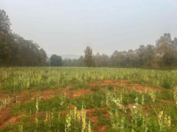 बलरामपुर-रामानुजगंज। जिले के कुसमी थाना क्षेत्र अंतर्गत त्रिपुरी गांव में प्रशासन और पुलिस के लिए बड़ा मामला सामने आया है। गांव की करीब 4 से 5 एकड़ जमीन पर अफीम की अवैध खेती का खुलासा हुआ है, जिससे इलाके में हड़कंप मच गया। जानकारी के अनुसार, झारखंड का एक व्यक्ति स्थानीय दो ग्रामीणों से चार एकड़ जमीन लीज पर लेकर शुरुआत में उन्हें फूलों की खेती का आश्वासन दिया। लेकिन बाद में उसी जमीन पर अफीम की खेती शुरू कर दी गई। जब ग्रामीणों को शक हुआ कि खेत में उगाए गए पौधे सामान्य फसल के नहीं बल्कि अफीम के हैं, तो उन्होंने इसकी जानकारी प्रशासन और पुलिस को दी।