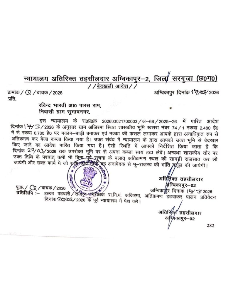 राजस्व निरीक्षक की रिपोर्ट के आधार पर अतिरिक्त तहसीलदार न्यायालय, अम्बिकापुर-02 द्वारा आदेश जारी कर स्पष्ट निर्देश दिए गए हैं कि: